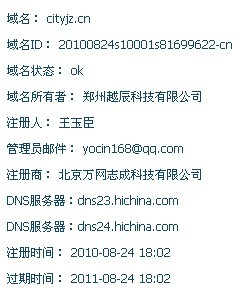 查询得知,cityjz.cn注册于2010年,注册时间较短,域名注册公司信息显示为郑州越辰科技有限公司。 都市家政网是从越辰科技独立出来的一个部门,目前针对家政信息将启用域名cityjz.cn作为都市家政网官网域名。 |