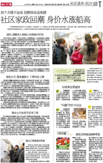 除了保姆身价水涨船高,很多小区也出现了招聘保洁和保安的困难。“年前外地的保安都回家了,到现在也没有回来报到,现在各个物业公司都在高薪聘请保安保洁。”名城新苑物业公司张经理介绍说,每每到了年后,各个物业公司都会面临用工荒的问题。